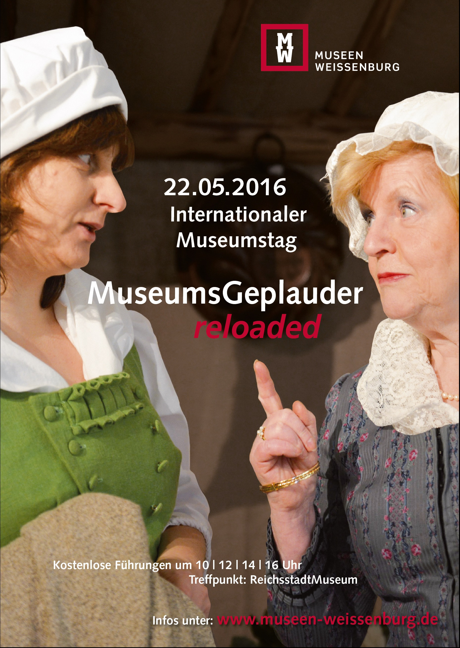 Im Rahmen des Internationalen Museumstages finden am 22. Mai 2016 um 1000, 1200, 1400 und 1600 kostenlose Führungen des „MuseumsGeplauder reloaded“ (für jeweils max. 20 Personen) statt. Der Treffpunkt ist vor dem ReichsstadtMuseum / der Tourist-Info in Weißenburg.
