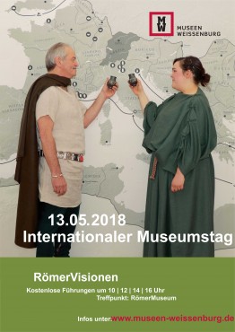 Am Internationalen Museumstag 2018 feiern die Museen Weißenburg die Premiere ihrer neuen Kostümführung. Um 10, 12, 14 und 16 Uhr können die Besucher in RömerVisionen zusammen mit einer fiktiven historischen Person, entweder der Römerin Mania Aurelia oder dem germanischen Hilfstruppensoldaten Lucius Barbaricus Equitius, die ereignisreiche Zeit am Anfang des 3. Jahrhunderts kennen lernen.