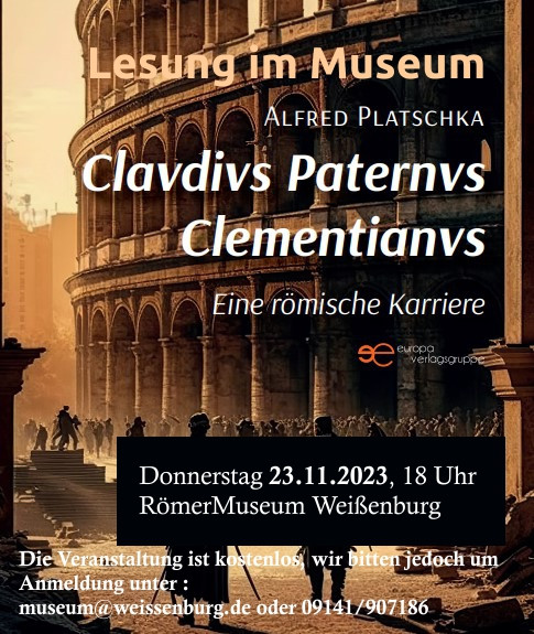 In passender Atmosphäre stellte Alfred Platschka sein Buch im RömerMuseum vor und gab dabei auch ausführliche Einblicke in seine Recherche. Er zeigte detailliert die archäologischen Hintergründe der Geschichte von Claudius Paternus Clementianus auf. Es war eine spannende Reise durch das ganze Römische Reich!