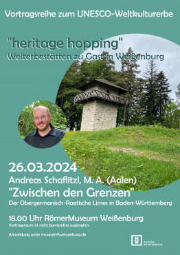 In Deutschland allein gibt es zurzeit (Stand 2023) 52 UNESCO-Welterbestätten, in Europa sind dies 491 Stätten. Als Teil des Obergermanisch-Rätischen Limes sind auch die archäologischen Stätten in Weißenburg, die zum antiken Biriciana gehörten, seit 2005 Welterbe. Mit dem Sitz des Bayerischen Limes-Informationszentrums und der UNESCO-Welterbetafel bildet Weißenburg eine wichtige Station für die Vermittlung des Welterbes. Eine neu etablierte Vortragsreihe der Museen Weißenburg soll deshalb auf das Welterbe in Deutschland und Europa aufmerksam machen und informieren. Mit mehreren Vorträgen im Jahr sind verschiedene Welterbestätten in Weißenburg zu Besuch und stellen sich vor. Den Start bildet am Dienstag den 26.03.2024 ein Vortrag über den Obergermanisch-Raetischen Limes in Baden-Württemberg von Andreas Schaflitzl, M.A., Limeskoordinator in Aalen. Damit wird zum Auftakt der Limes im Zentrum stehen und von dort weitere Welterbestätten erkundet.