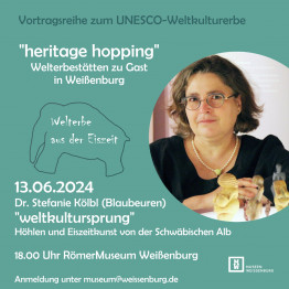 Für den 2. Vortrag der Reihe „Heritage Hopping – Welterbestätten zu Gast in Weißenburg“ im RömerMuseum war Frau Dr. Stefanie Kölbl zu Gast. Nachdem im ersten Vortrag das Welterbe vor Ort, der obergermanisch-rätische Limes vorgestellt wurde, ging weit in der Menschheitsgeschichte zurück, zu einem der ältesten Weltkulturerbestätten oder wie es die Wortschöpfung „weltkultursprung“ schön formuliert - zu den Ursprüngen der Kultur.